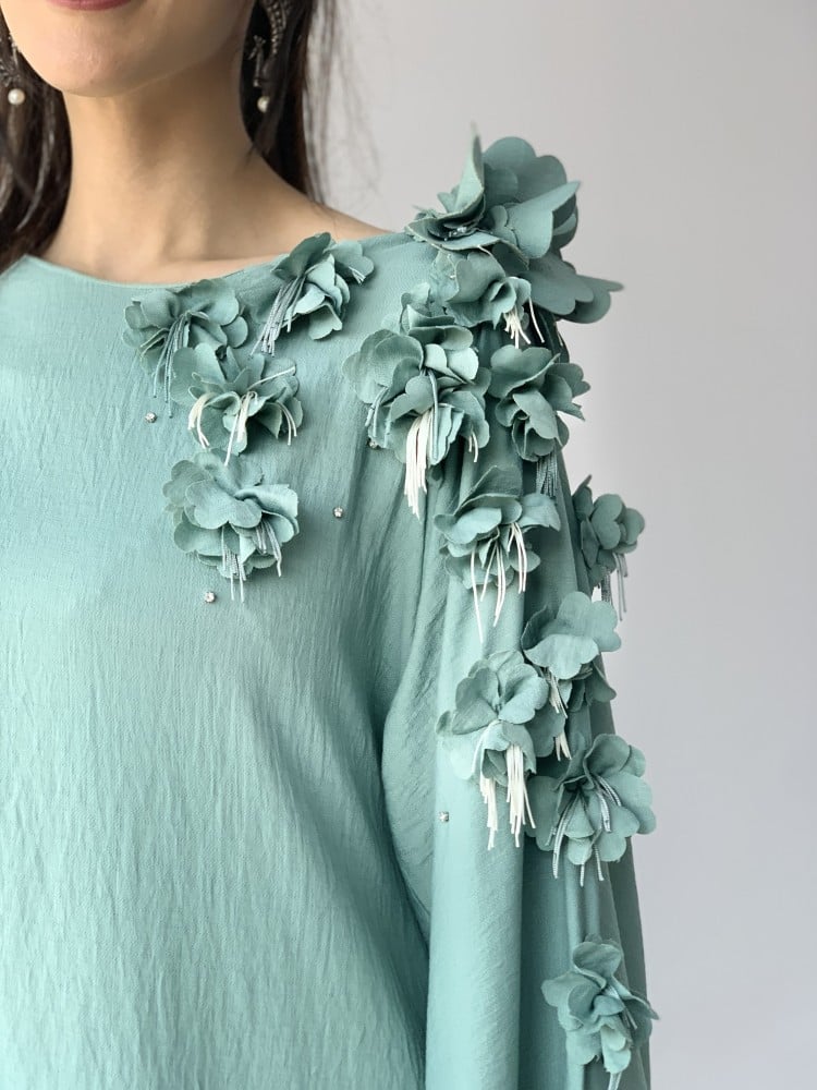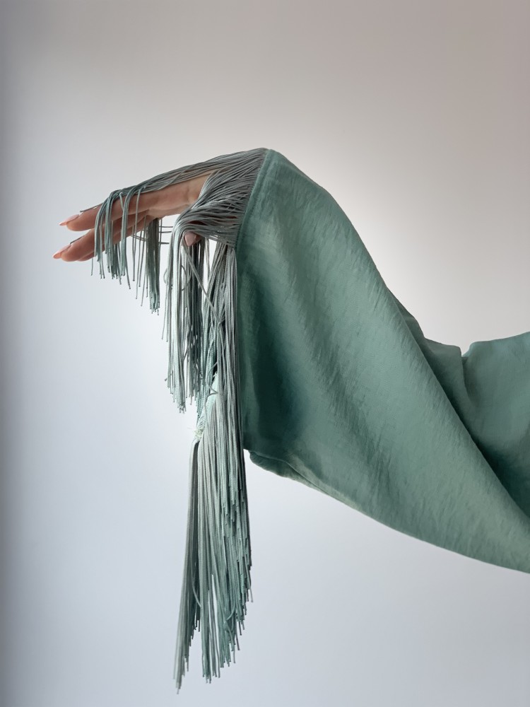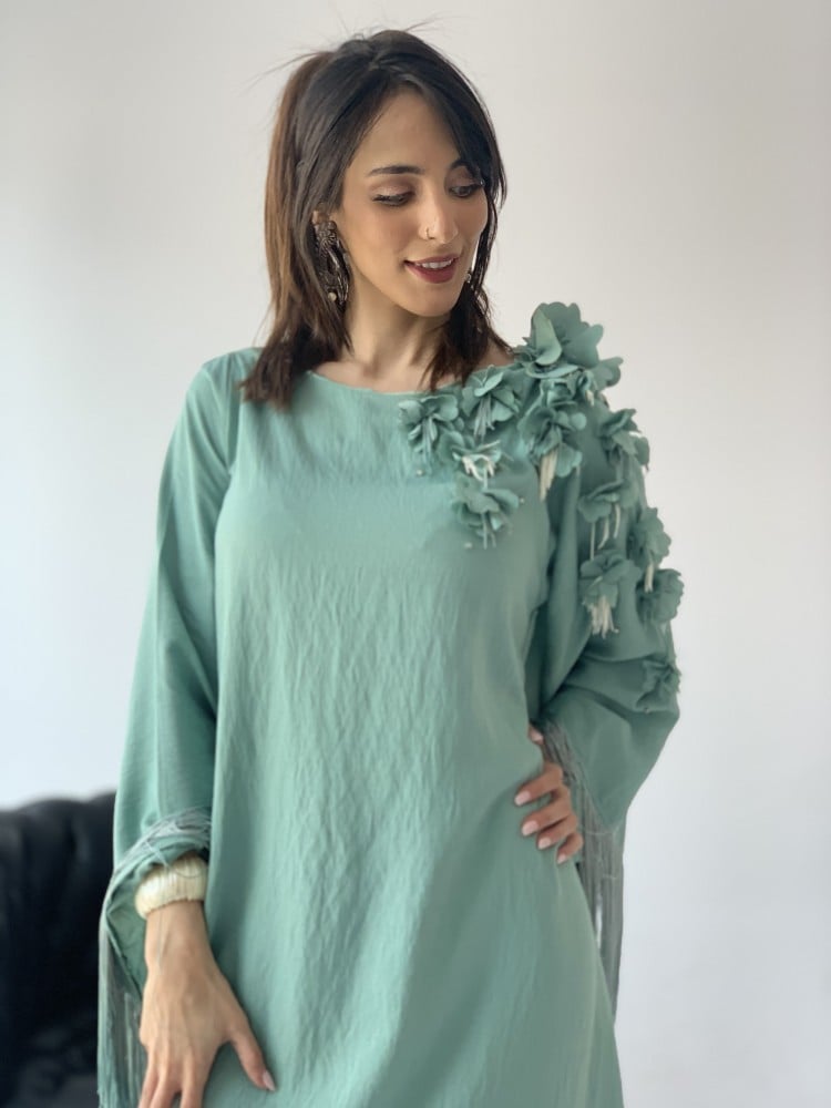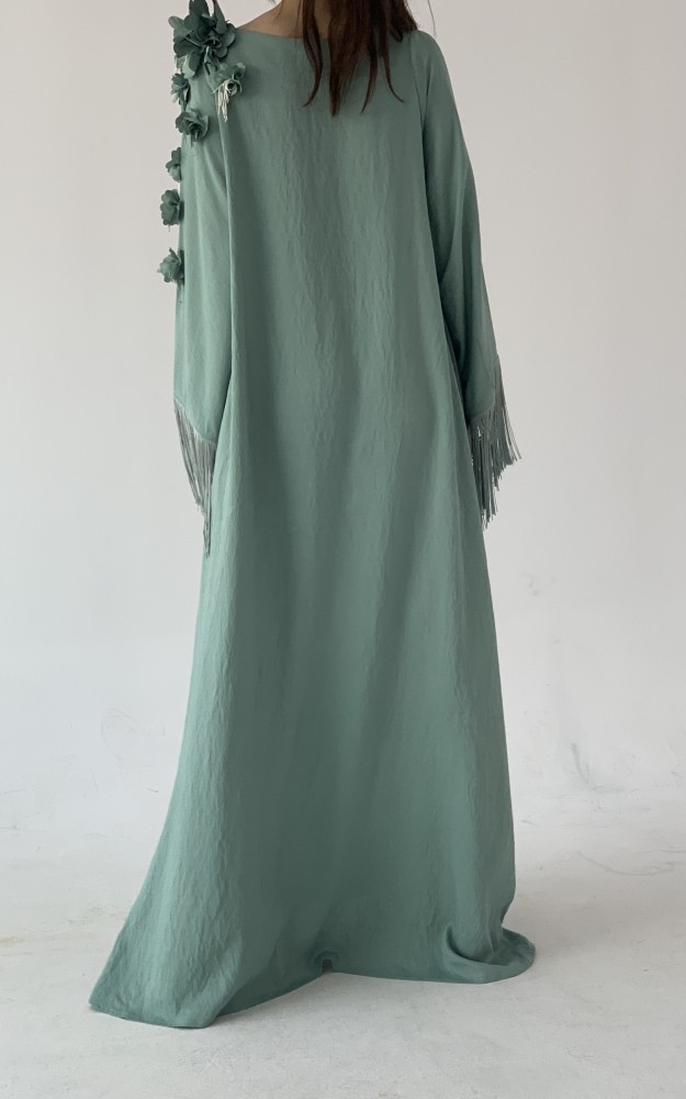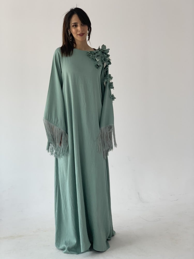 جلابية هدب وورد بارز فستقي