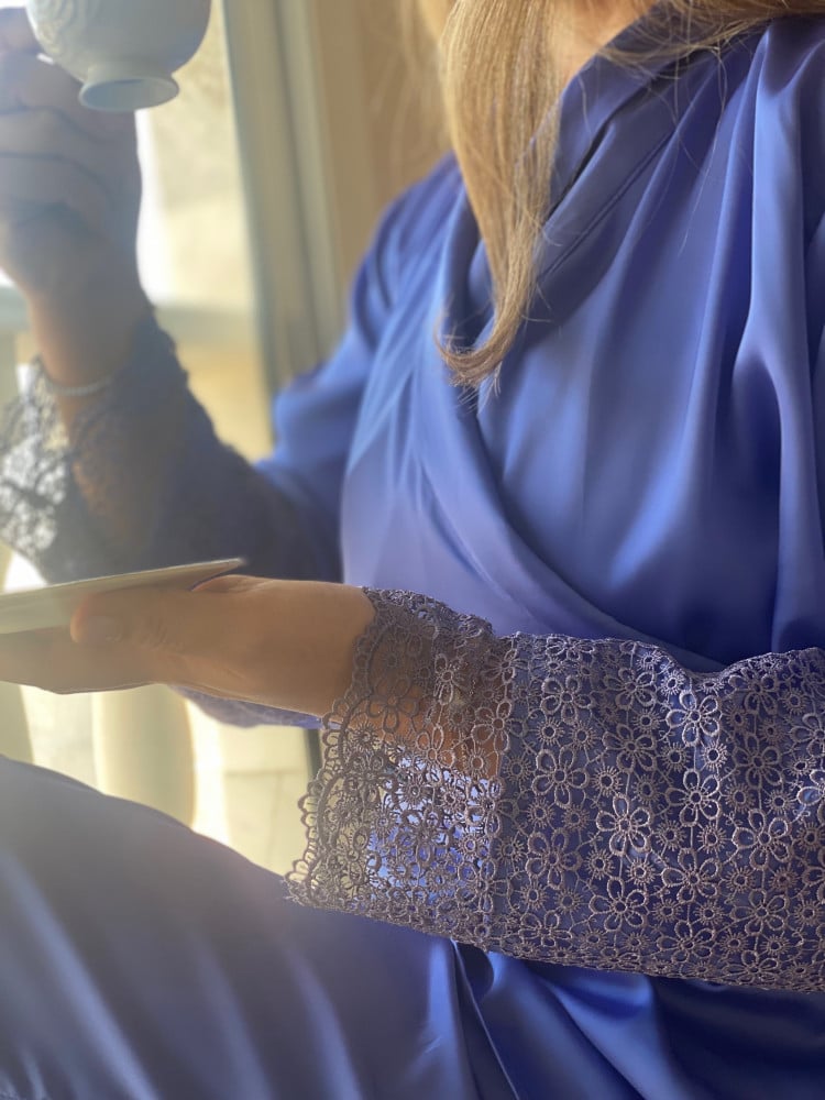 - بيجامة حرير ازرق مزينة بالازارير من الامام