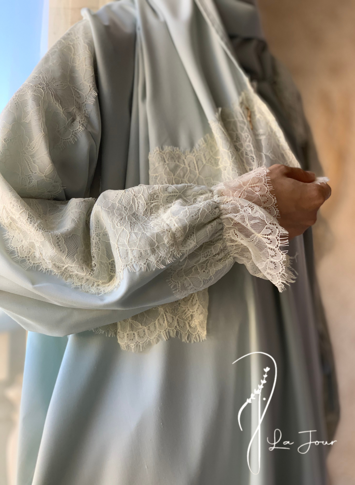 شرشف مرد أخضر باستيل مزين بالدانتيل مع طرحة مثبتة هو خيار رائع لصلاة مريحة وأنيقة. يجمع بين الألوان الهادئة والتفاصيل الرقيقة، مما يضفي لمسة جمالية على تجربة الصلاة.
