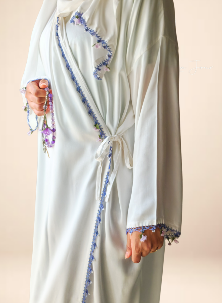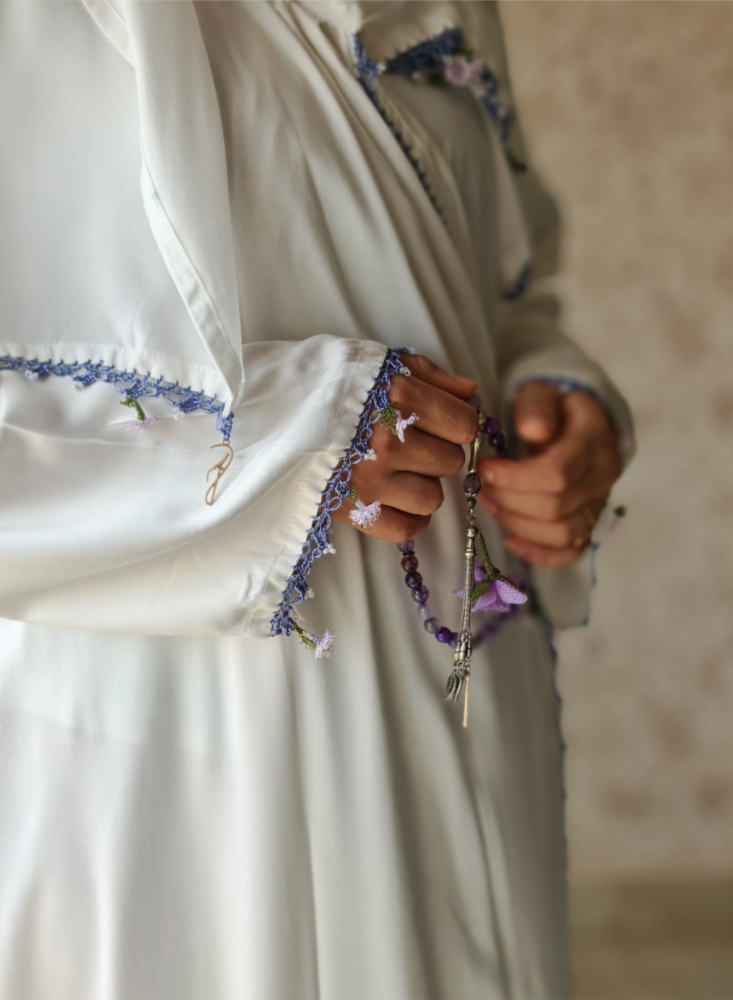 شرشف صلاة لف ابيض ستان مزين بالورد الاويا موف فاتح ( كروشيه تركي ينفذ بالابرة👌🏻) يدوي