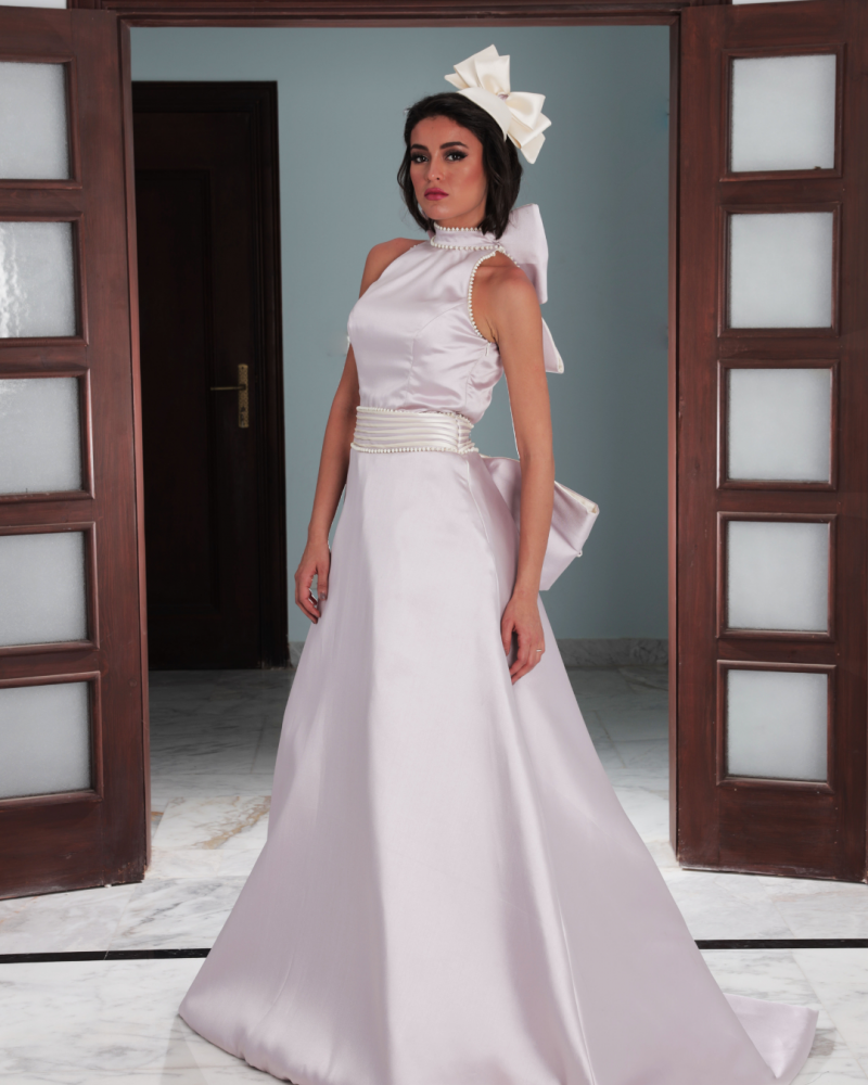 فستان من التفتة الموف و السكري بالاضافة الي فيونكة من الخلف