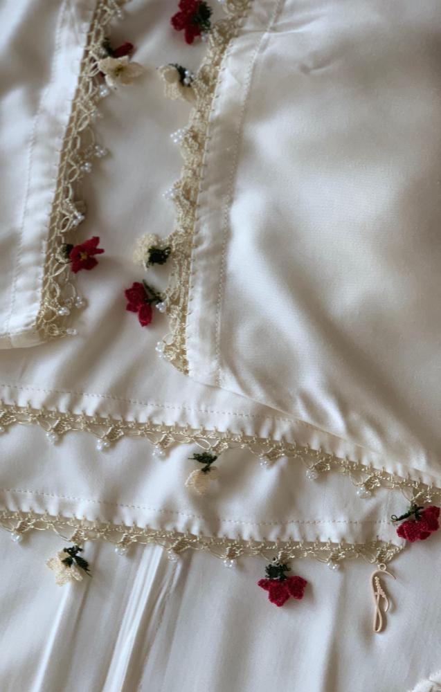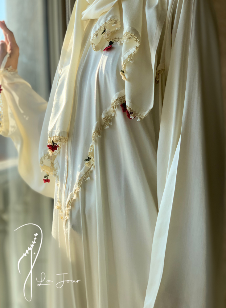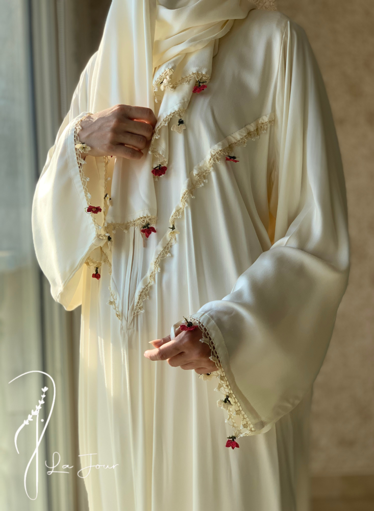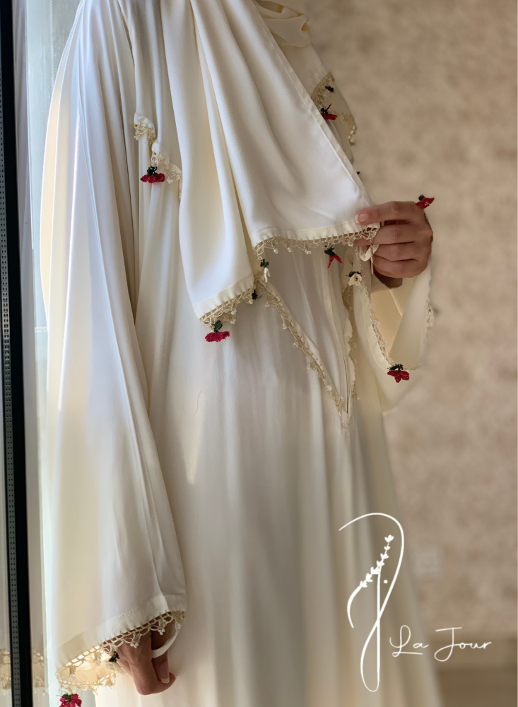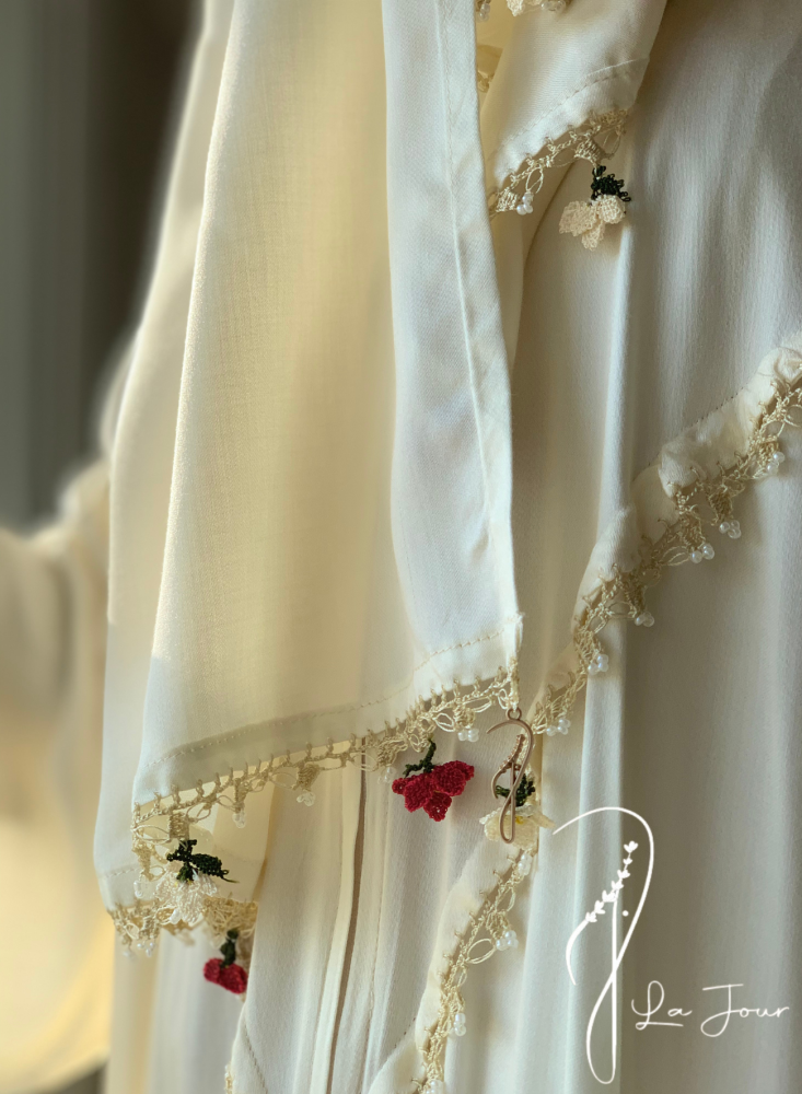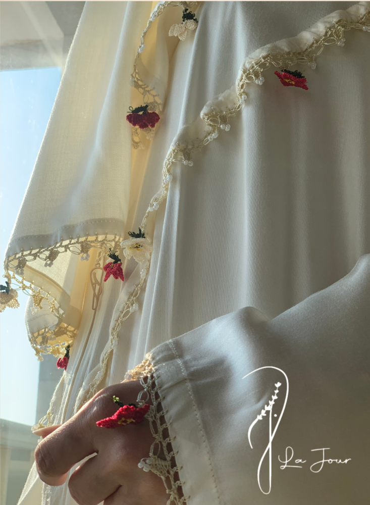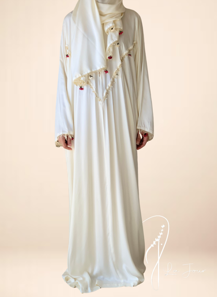 تجربة صلاة مميزة. يتميز بتصميم فاخر يجمع بين النعومة والجمال بفضل التفاصيل الدقيقة للكروشيه والورود الأويا المطرزة بعناية. اللون الأوف وايت الأنيق يضفي لمسة كلاسيكية تناسب جميع الأذواق وتجعله مناسبًا لجميع المناسبات الدينية.