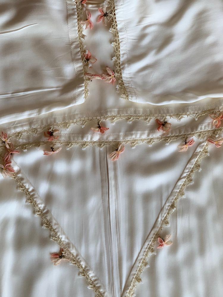 شرشف صلاة سستة سكري مزين بالكروشيه و الورود اويا ، الطرحة مثبتة .
