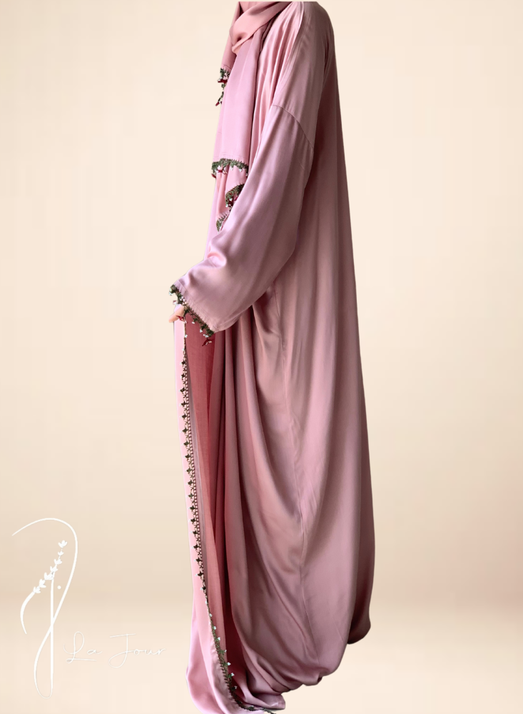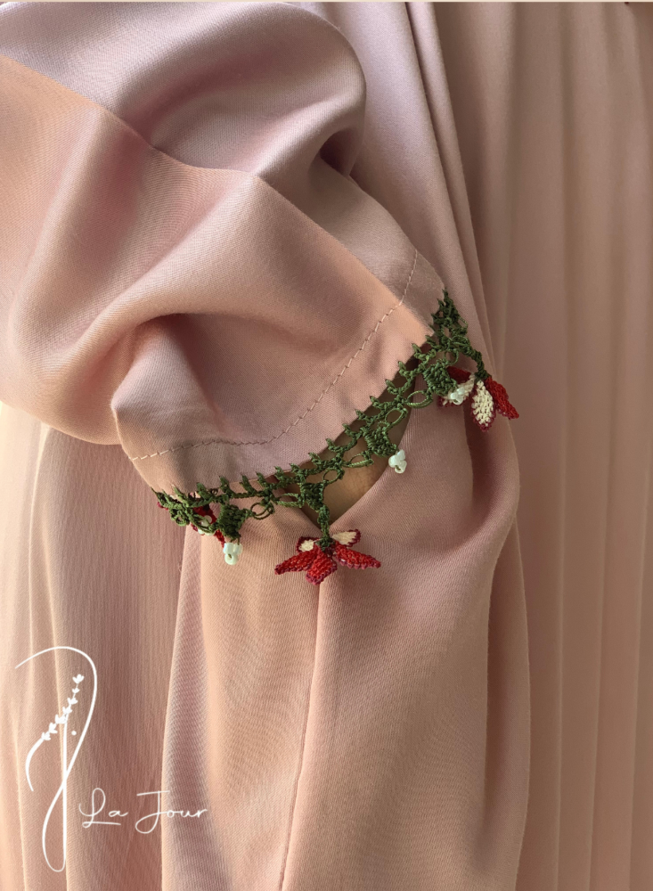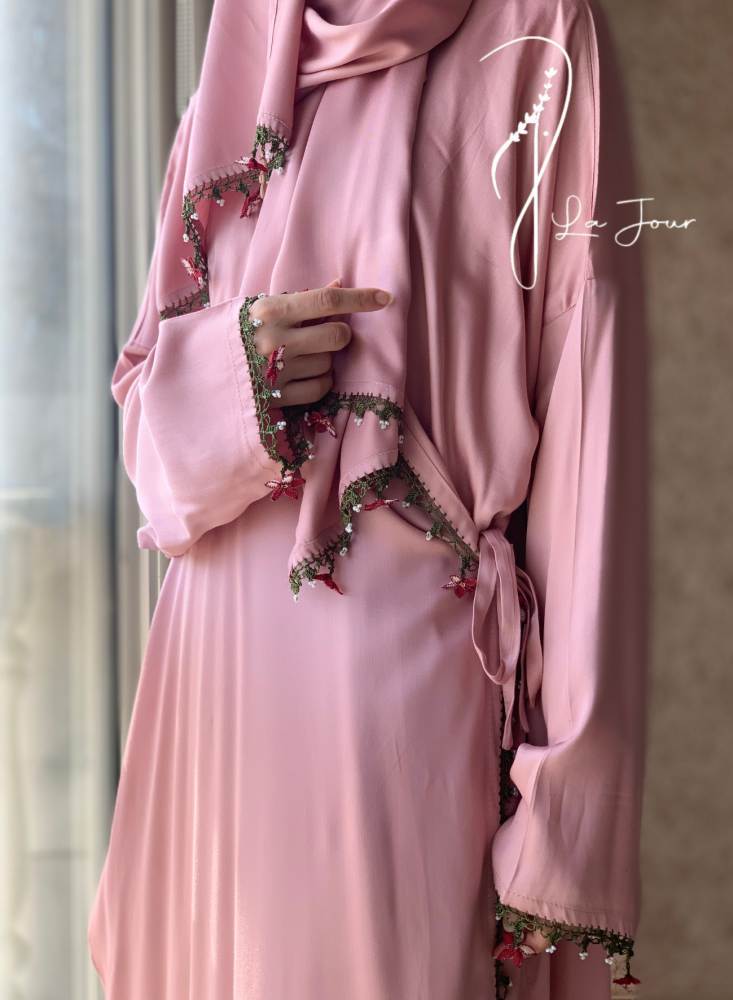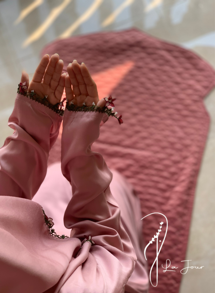 A unique prayer experience. It features a luxurious design that combines softness and beauty thanks to the delicate crochet details and carefully embroidered Oya roses. The pink color adds a classic touch that suits all tastes and makes it suitable for all religious occasions.
