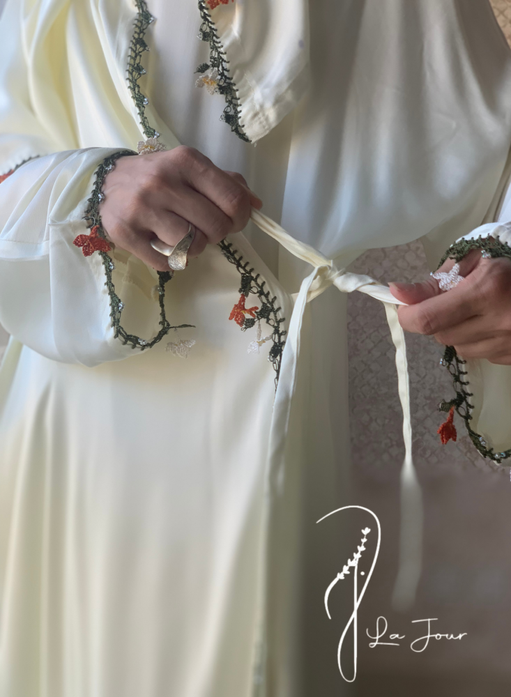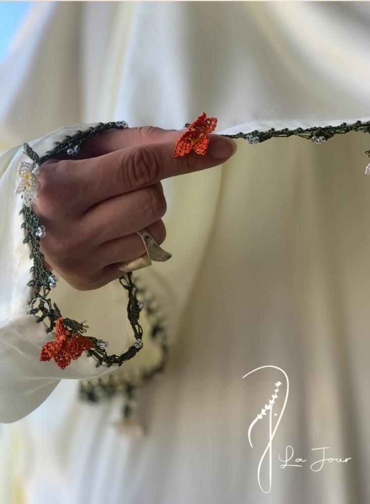 A unique prayer experience. It features a luxurious design that combines softness and beauty thanks to the delicate crochet details and carefully embroidered Oya roses. The elegant off-white color adds a classic touch that suits all tastes and makes it suitable for all religious occasions.